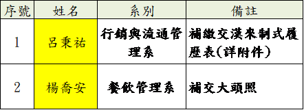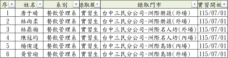 115學年實習 漢來美食股份有限公司 錄取名單
