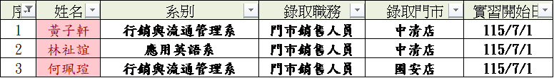 115學年實習 三商行股份有限公司(鞋 全家福) 錄取名單