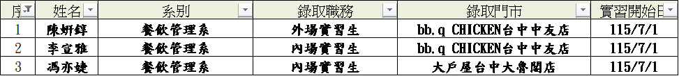 115學年實習 全家國際餐飲 錄取名單